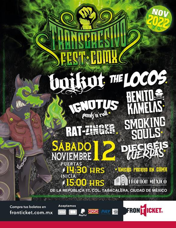 Es así que Boikot, The Locos, Rat-Zinger, Benito Kamelas, Smoking Souls y Dieciséis Cuerdas están listos para hacer una única presentación exclusiva en la Ciudad de México en el reconocido Frontón México el Sábado 12 de Noviembre a partir de las 14:30 hrs con boletos a la venta en el Sistema FronTicket en https://fronticket.boletosenlinea.events/eventperformances.asp?evt=767 y en puntos de venta autorizados a un costo de $800.00.