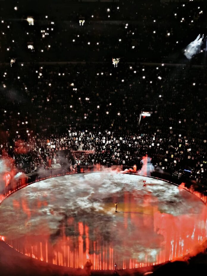 Desde el arranque, el mensaje fue claro: esto no era nostalgia. Con una estética minimalista, luces duras y un escenario casi desnudo, Ye apostó por la atmósfera antes que el exceso. A lo largo del show aparecieron fragmentos y versiones reinterpretadas de canciones clave de su carrera como “Power”, “Stronger”, “Black Skinhead” y “Runaway”, integradas más como parte de un relato que como simples momentos coreables.